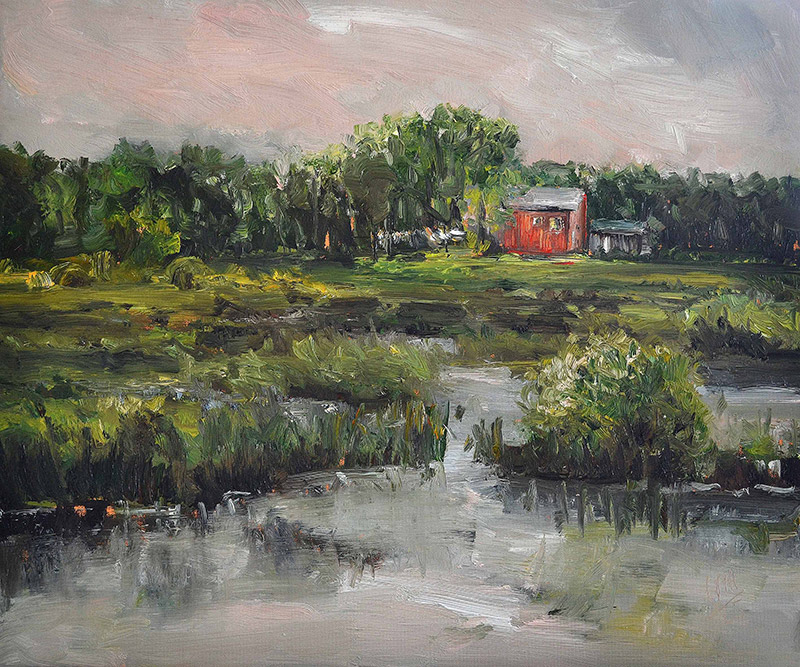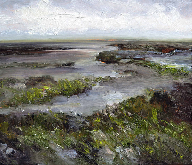Ihre Landschaften sind Ur-Landschaften, archetypische Stimmungen. Man erkennt die Ostsee, die Dünen, das Licht des Nordens – und doch ist es nicht diese eine Düne, nicht jener genauer Tag. Es ist die Essenz davon. Erinnerung nicht als Rückblick, sondern als Destillat. Pastös und kraftvoll auf die Leinwand gebracht.